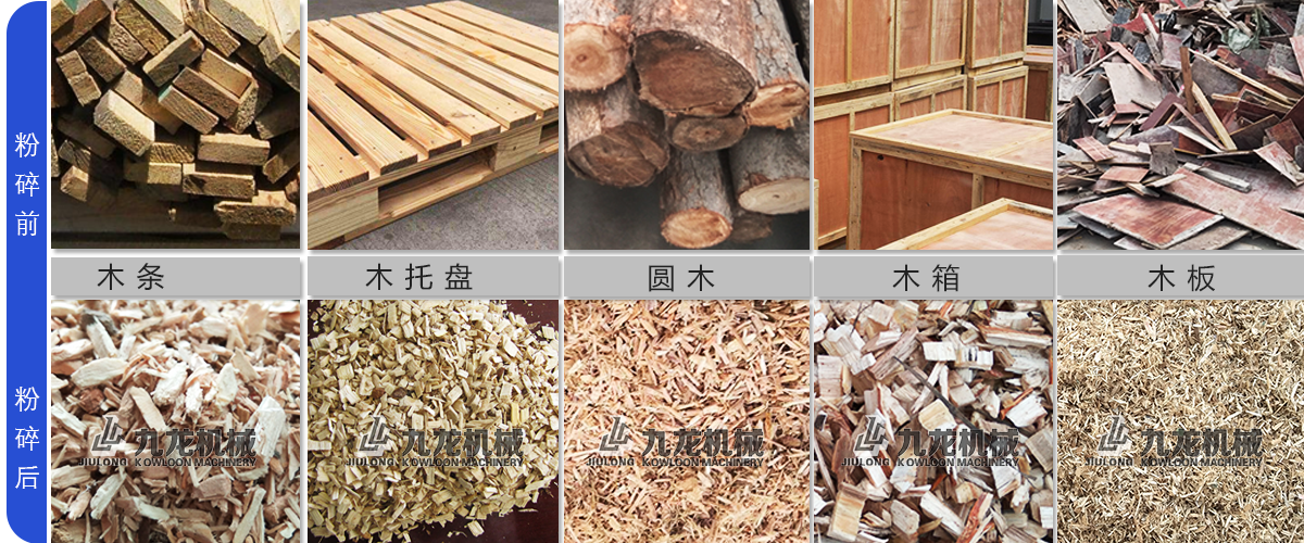 各種廢舊木材、板材料、木托盤、下腳料、舊家具、木板、木箱等?,F(xiàn)在粉碎木材和農(nóng)作物的人越來(lái)越多,木材破碎后可以應(yīng)用在電廠發(fā)電,制作香行業(yè)、能源棒的生產(chǎn)和菌菇生產(chǎn)養(yǎng)殖等等不同的領(lǐng)域。